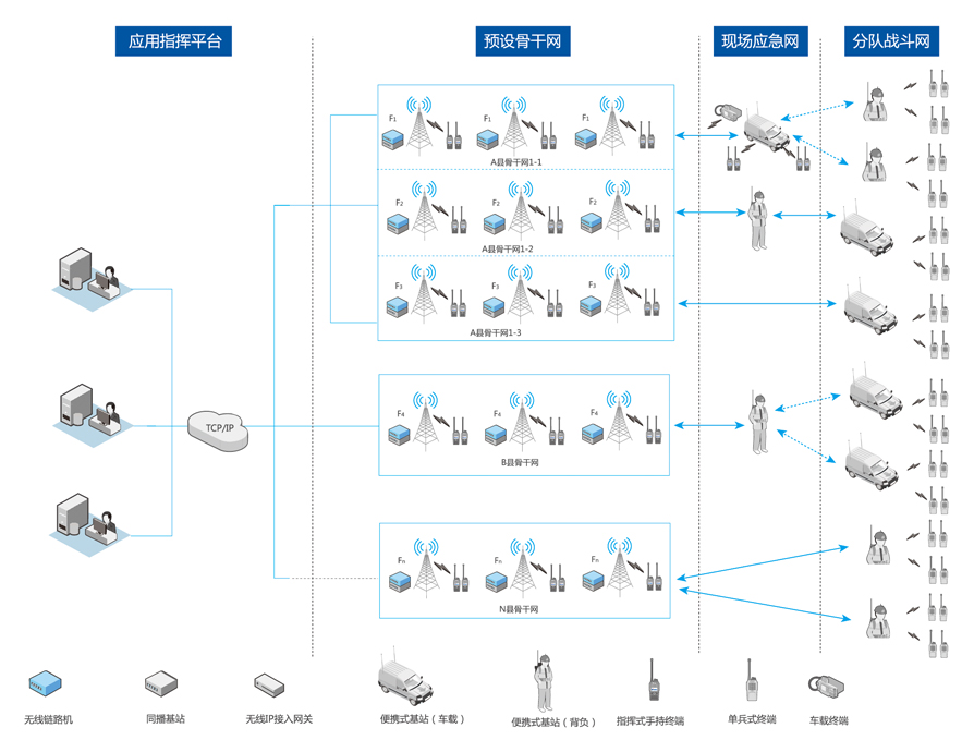 BF-9000任務(wù)關(guān)鍵型通信系統(tǒng)符合PDT/DMR通信體制并向下兼容模擬制式,系統(tǒng)整體設(shè)計(jì)采用預(yù)設(shè)骨干網(wǎng)、現(xiàn)場(chǎng)應(yīng)急網(wǎng)、分隊(duì)?wèi)?zhàn)斗網(wǎng)三層組網(wǎng)方式。同時(shí)系統(tǒng)可以與MESH無(wú)線自組網(wǎng)、超短波通信、北斗衛(wèi)星通信、4G專網(wǎng)通信、4G公網(wǎng)通信、衛(wèi)星通信等多種通信手段相結(jié)合實(shí)現(xiàn)融合通信。完美運(yùn)用現(xiàn)代數(shù)字通信技術(shù),充分結(jié)合應(yīng)急通信保障場(chǎng)景,貼近實(shí)戰(zhàn)要求,便于快速部署穩(wěn)定可靠。
