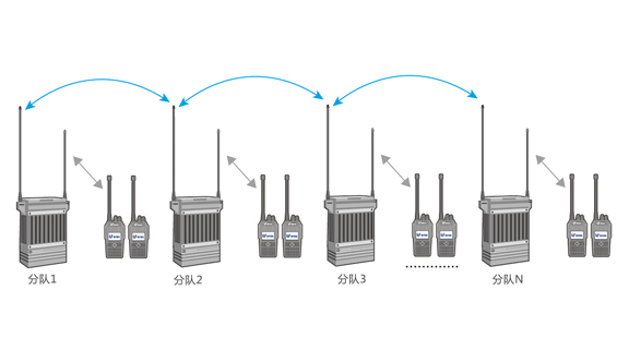 多臺(tái)便攜式數(shù)字雙頻中繼臺(tái)組網(wǎng)形成雙頻自組網(wǎng)網(wǎng)絡(luò),雙頻中繼臺(tái)的某一段工作在自組網(wǎng)模式保障各分隊(duì)之間的互聯(lián);另一段工作在同頻中繼模式保障本分隊(duì)內(nèi)部通信。
